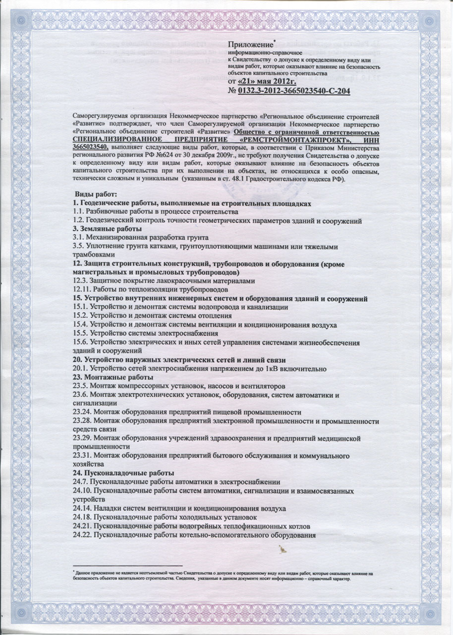 Приложение информационно-справочное к Свидетельству о допуске к определенному виду или видам работ, которые оказывают влияние на безопасность объектов капитального строительства № 0132.3-2012-3665023540-С-204 от 21 мая 2012 г.